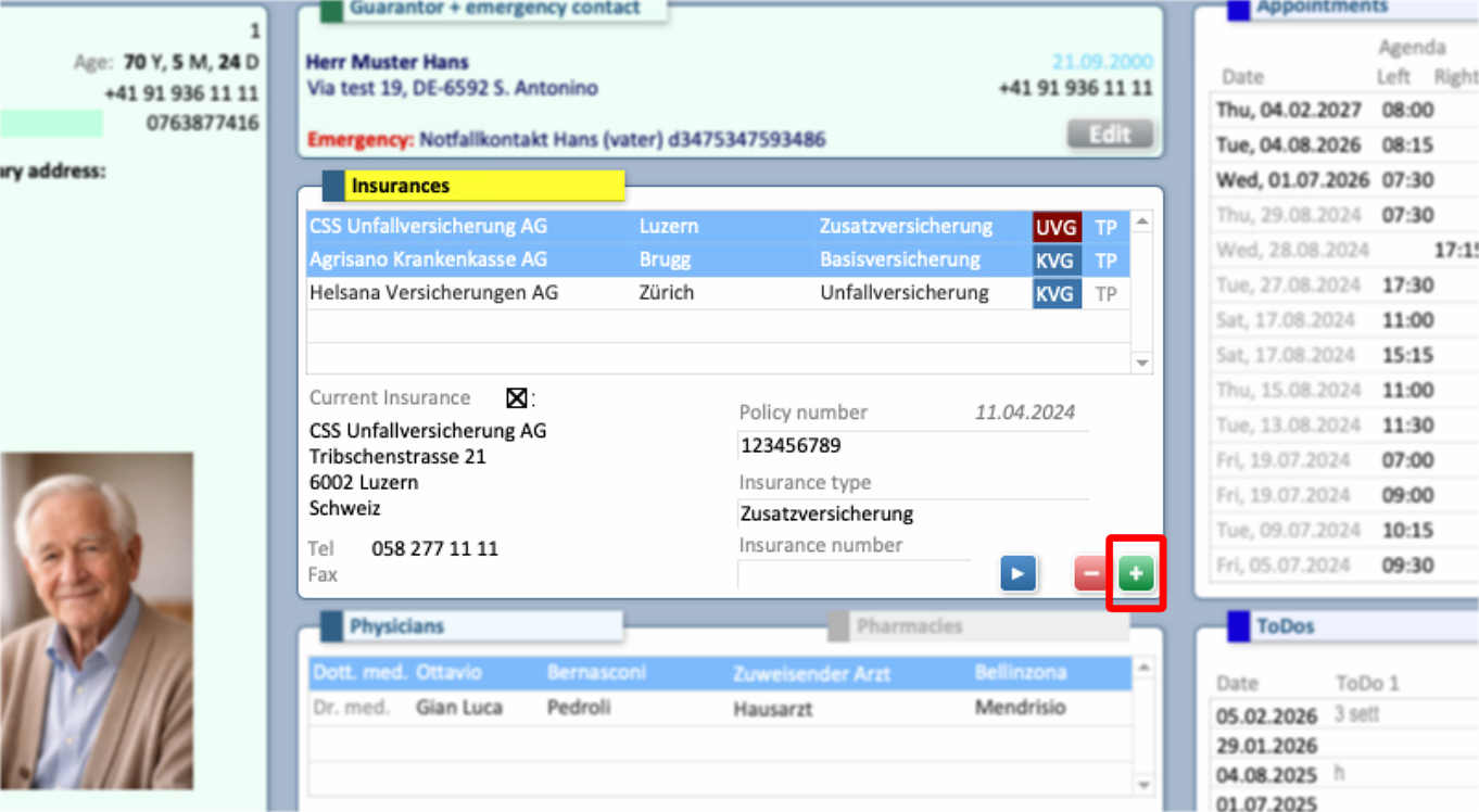 - After opening the correct Patient's record, Select + in the Insurances segment, to open the option menu