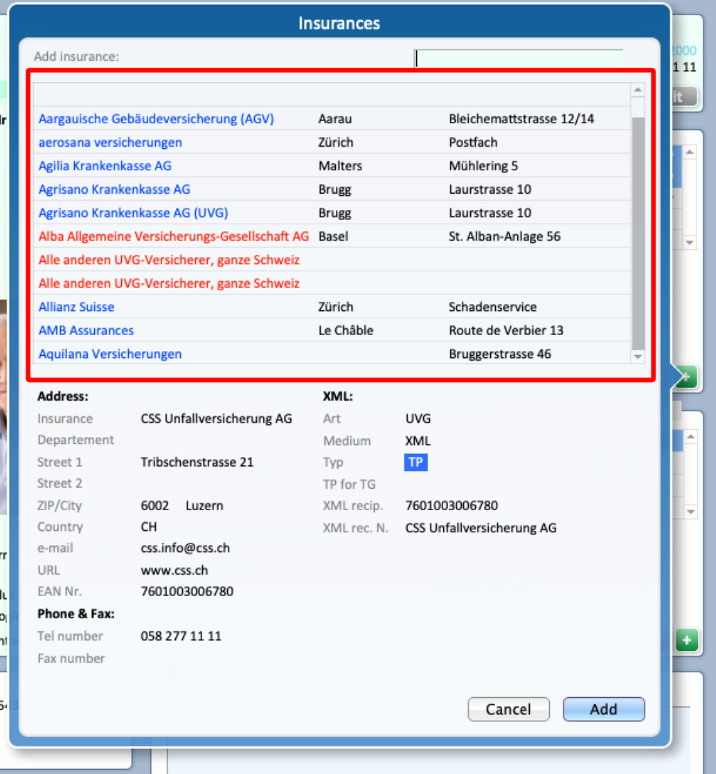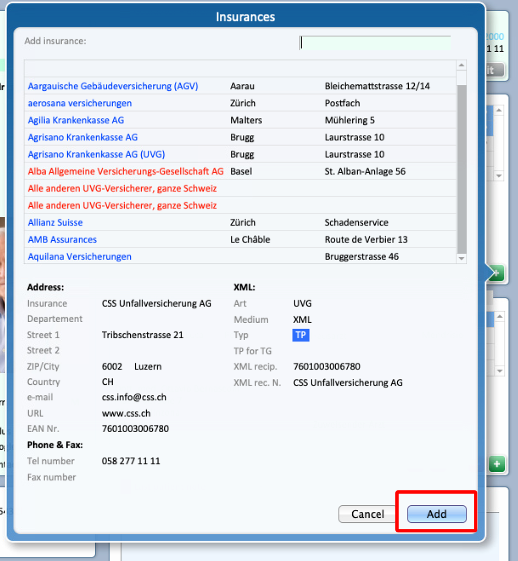 - Select from the list the desired Insurance to add it to the Patient's profile