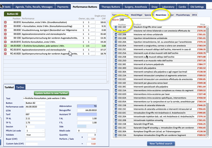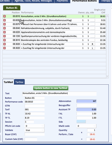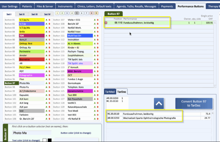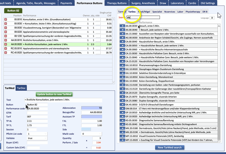 The goal is to populate the existing performance buttons (which contain TARMED codes) with their respective TARDOC equivalents.