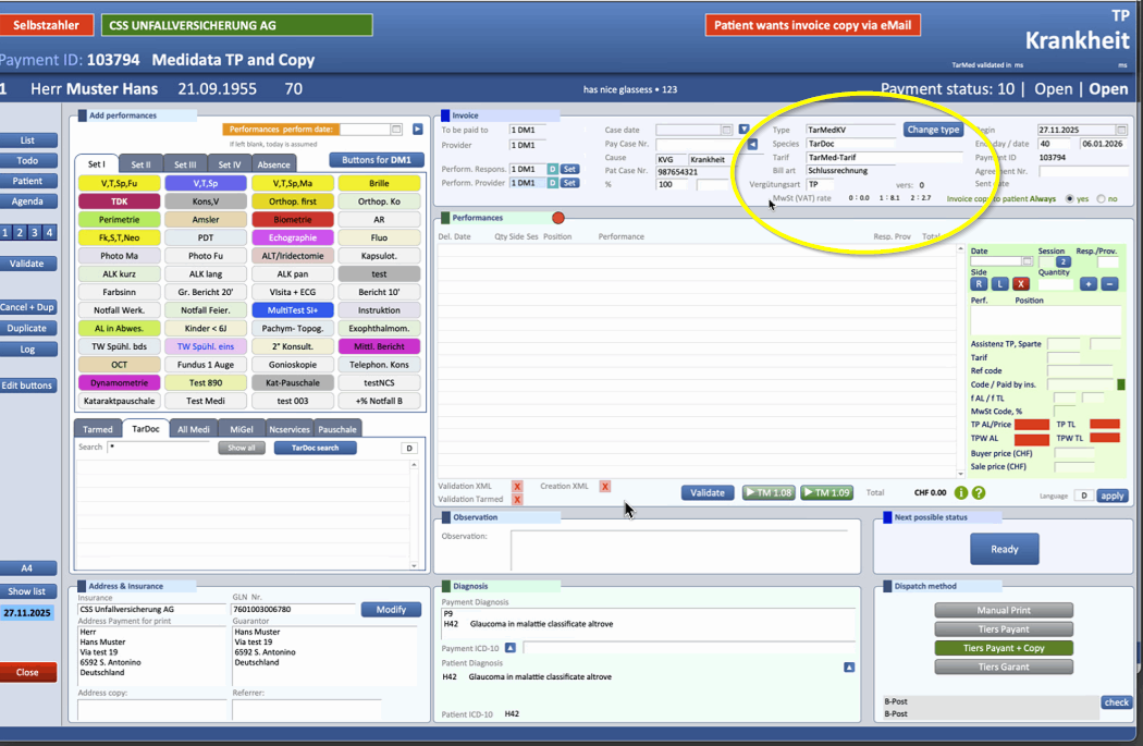 TARMED codes if the invoice is set to TARMED (retroactive invoices).
