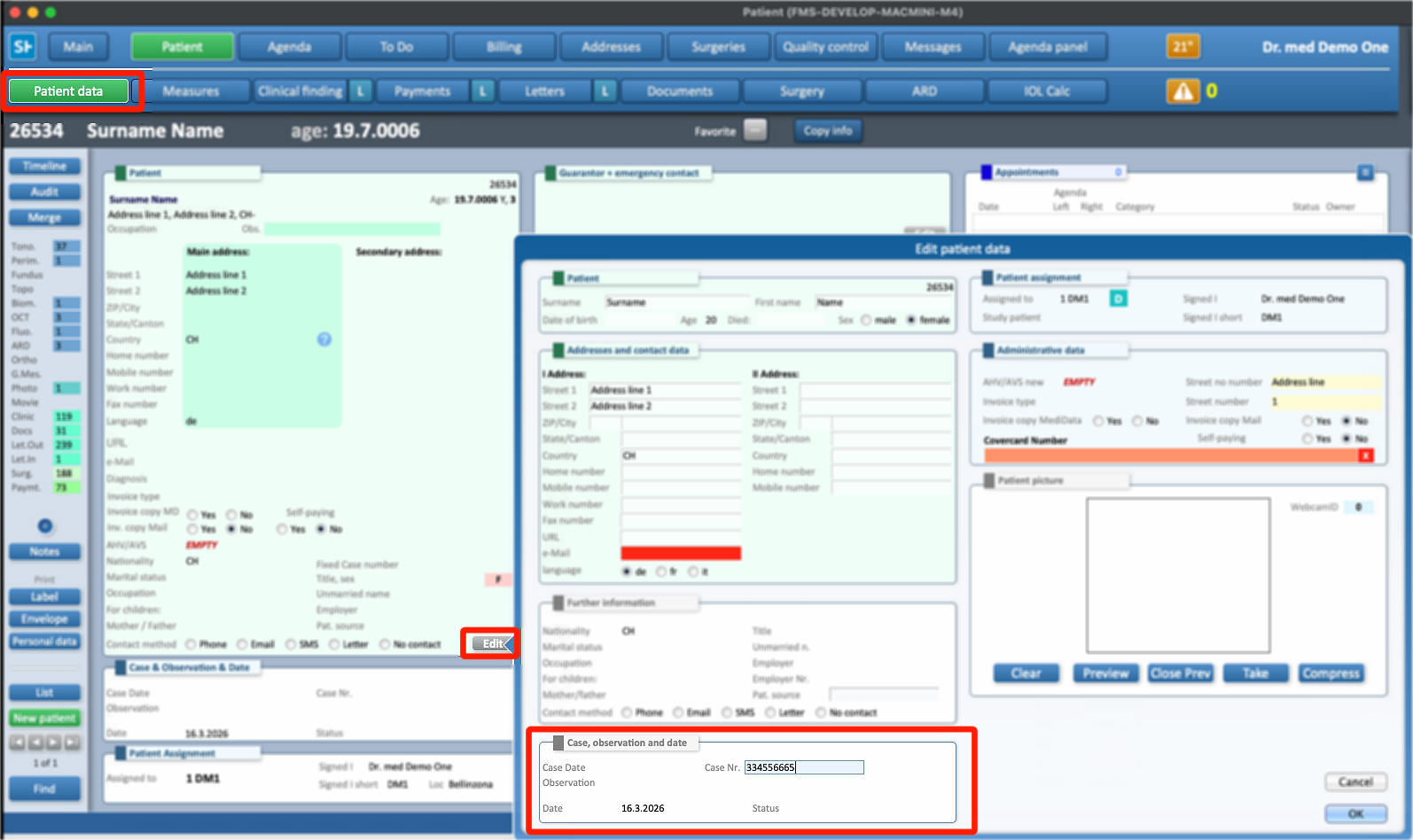 Solution: In the patient profile, go to the Payments section. Open the invoice related to the issue and enter the case number in the “Pay case nr.” field