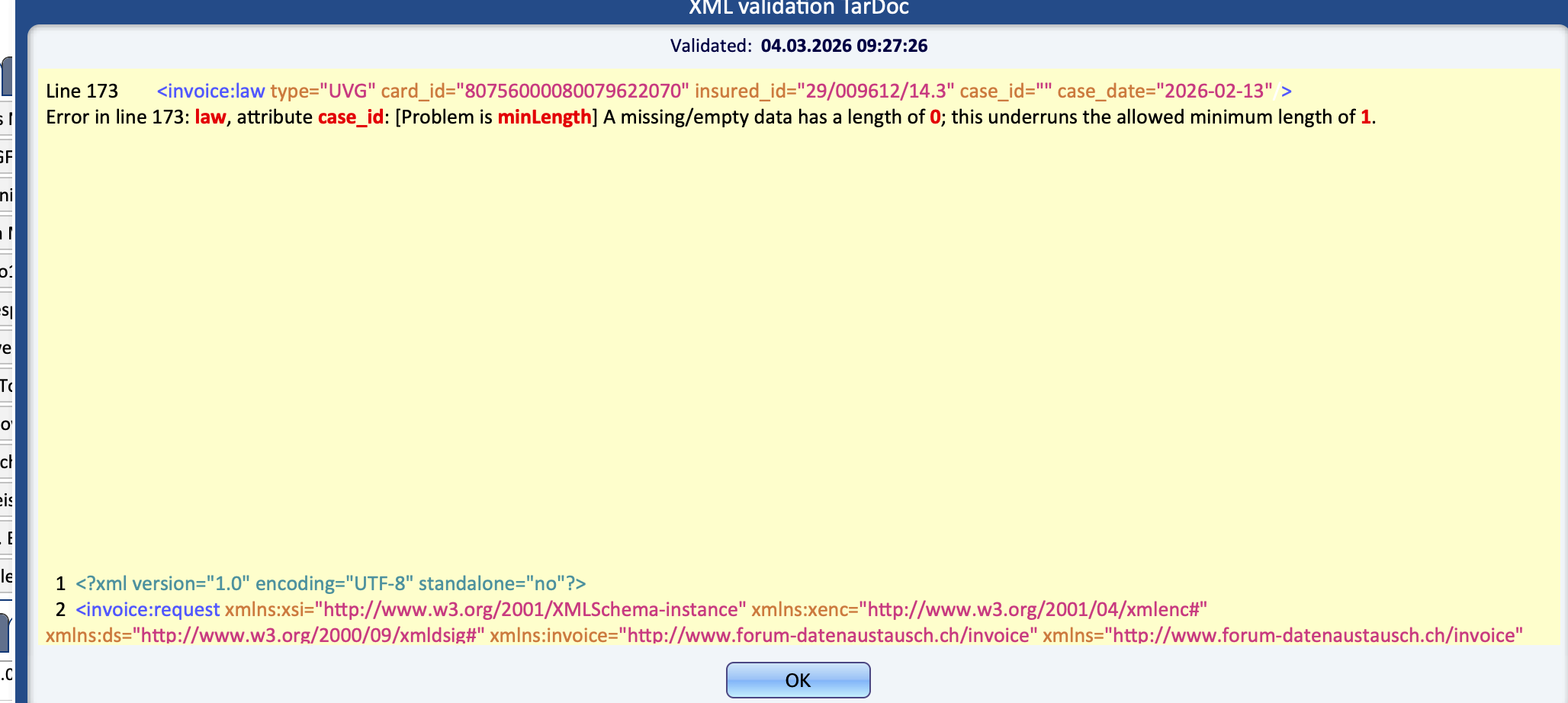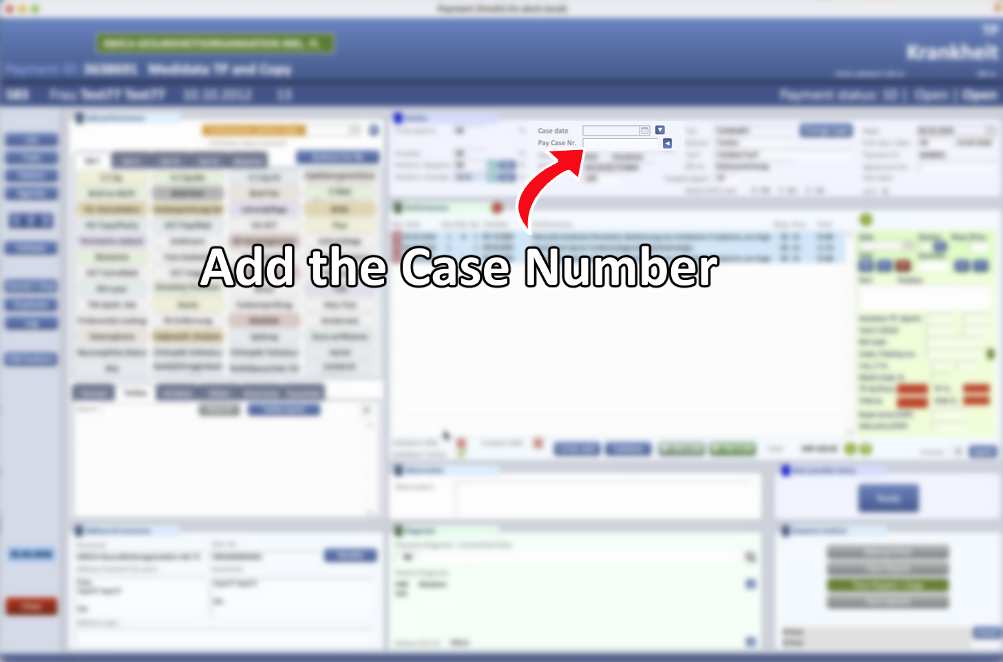 Solution: In the patient profile, go to the Payments section. Open the invoice related to the issue and enter the case number in the “Pay case nr.” field